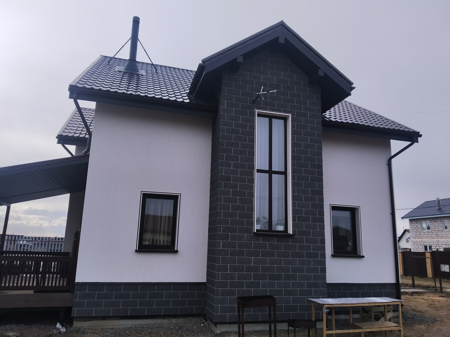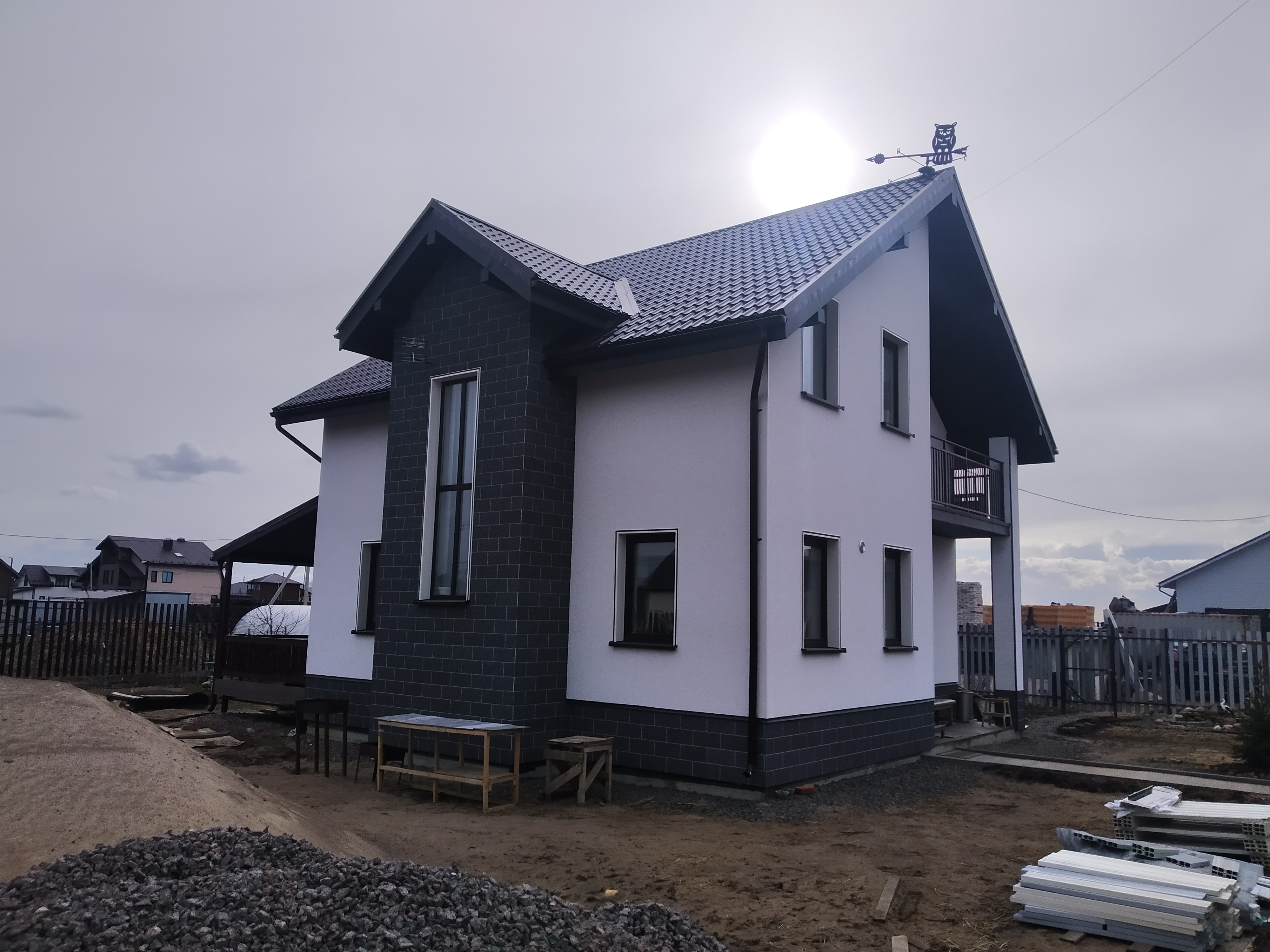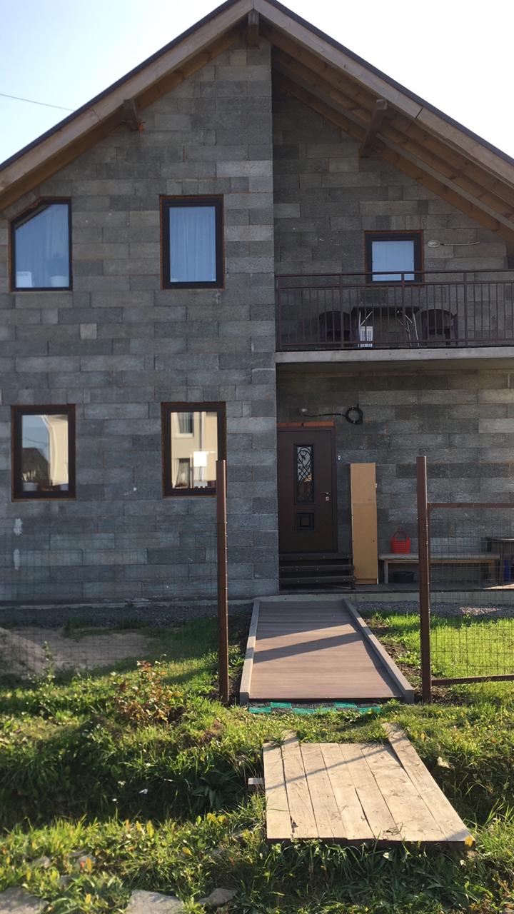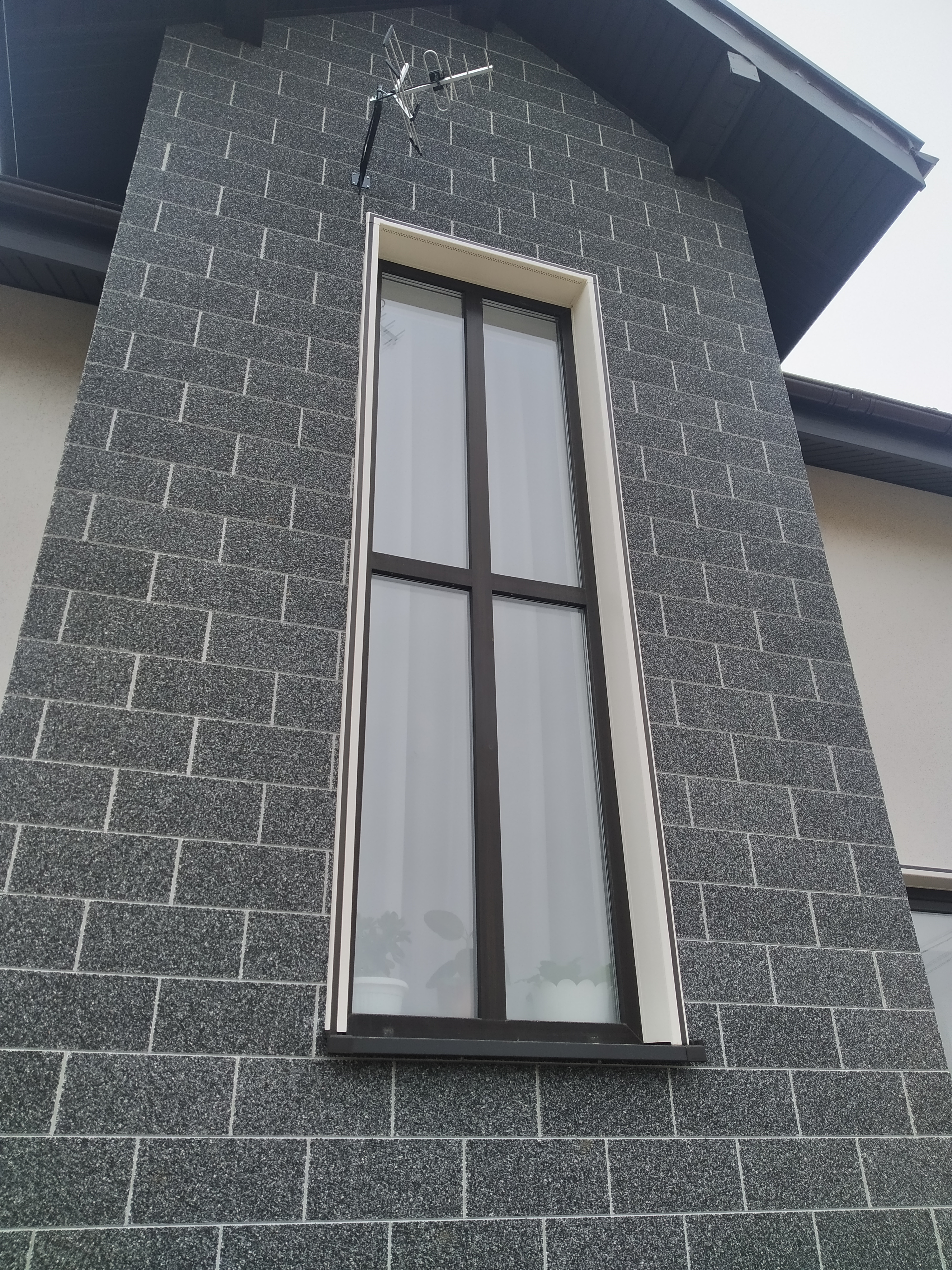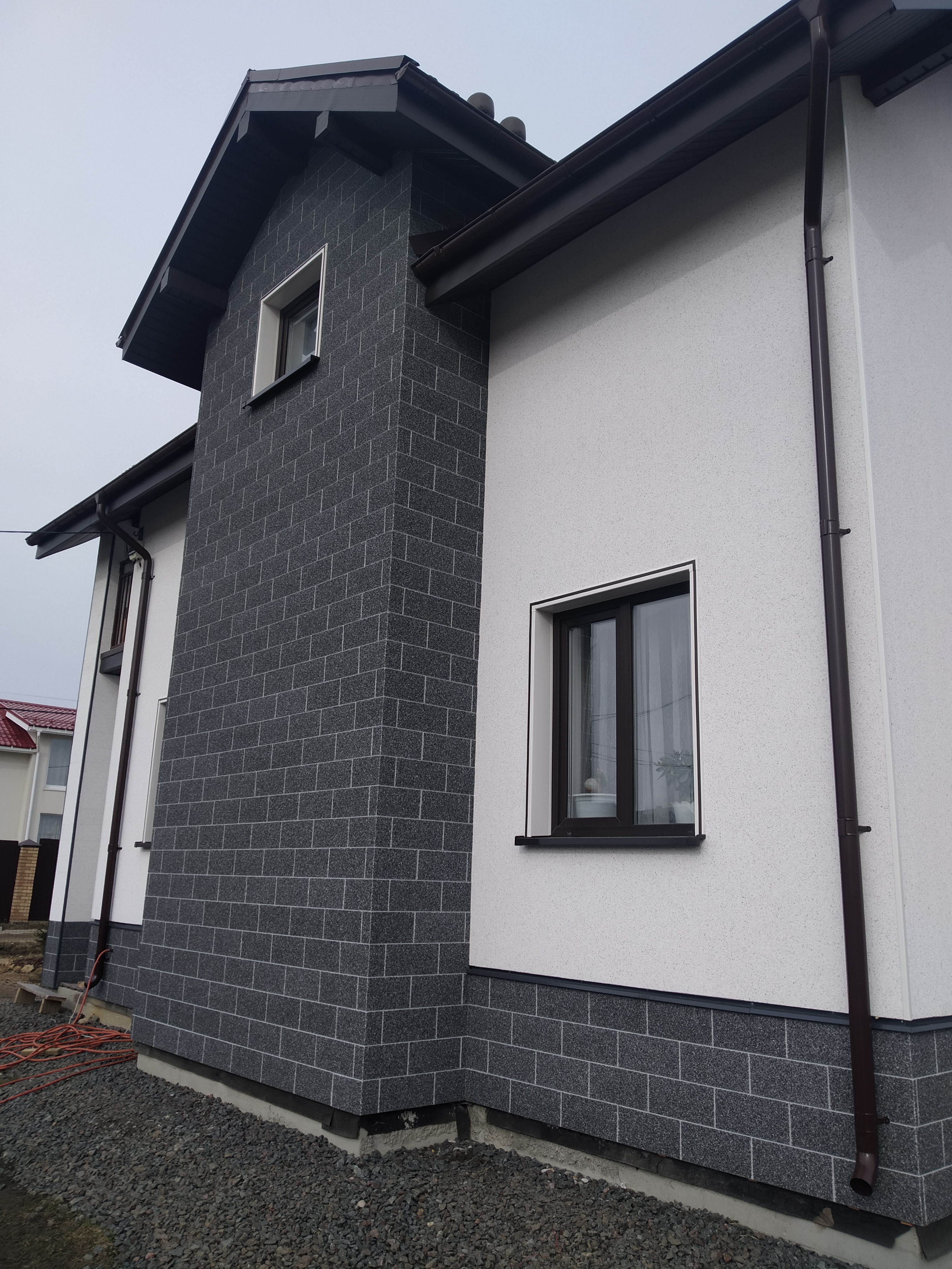 Заказчица Ольга Ягудина выбрала для своего загородного дома фасадные панели Vinylit в комбинации VinyTherm в цвете Альпин и VinyStone в цвете Базальт, а для отделки оконных откосов систему VinyCom.