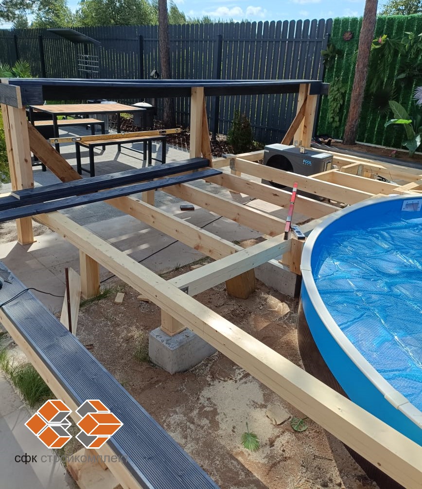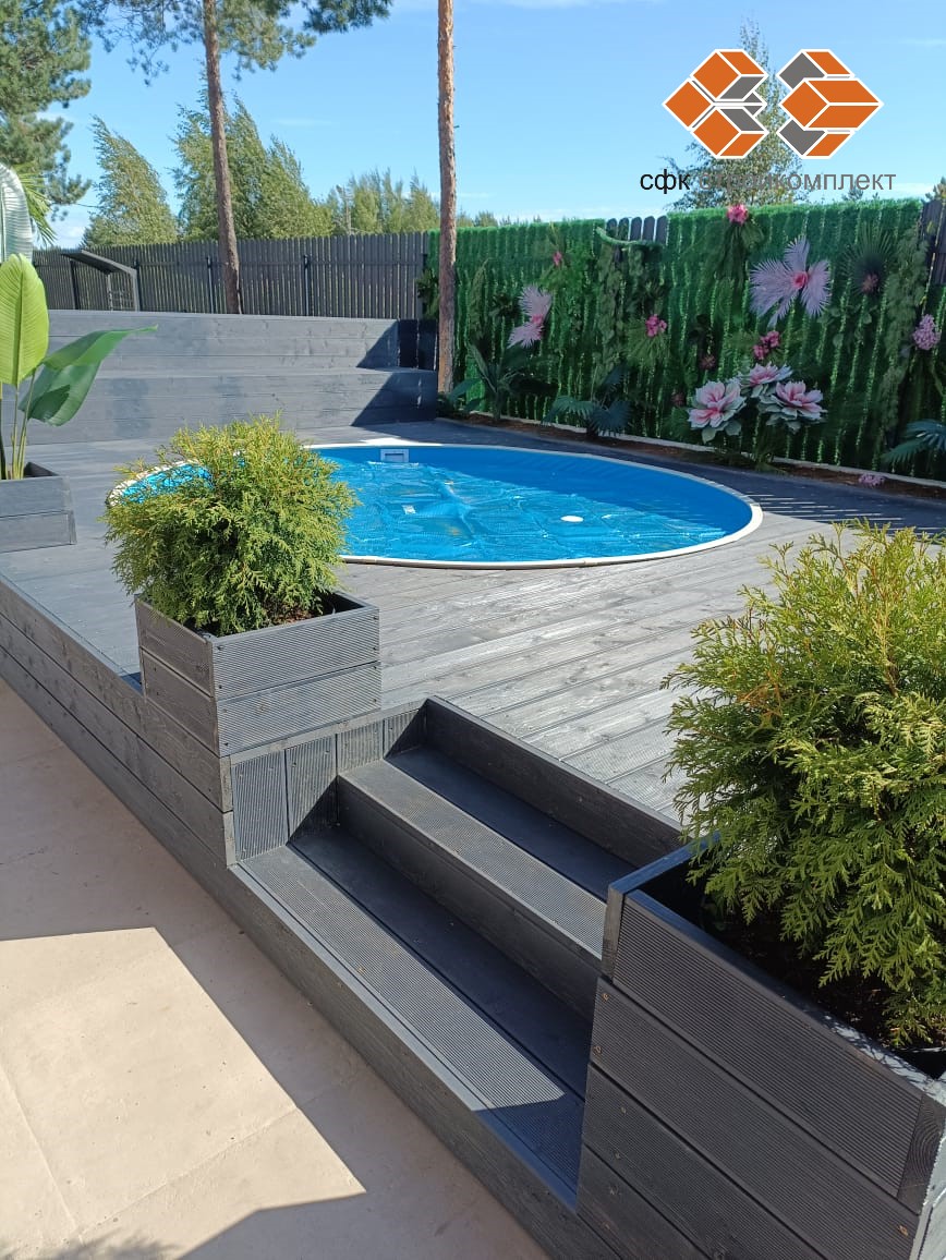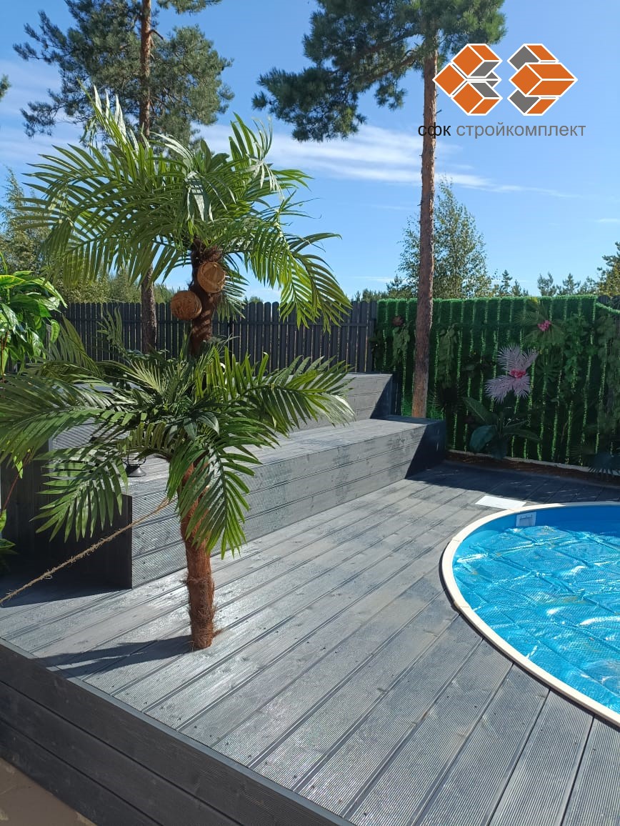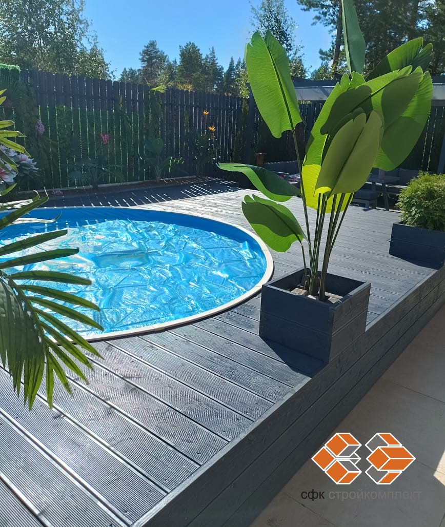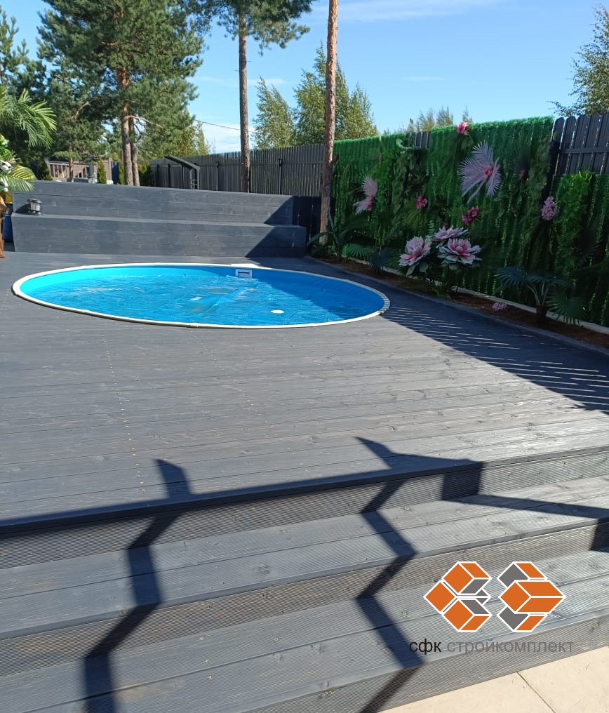 На объекте в Ленинградской области в к.п. Северная Жемчужина компания СФК Строй Комплект осуществила проектирование, расчет, поставку и монтаж террасной доски из ДПК. Наибольшую сложность при монтаже представляет примыкание террасы к круглому бассейну.